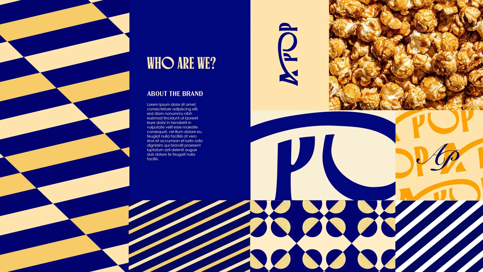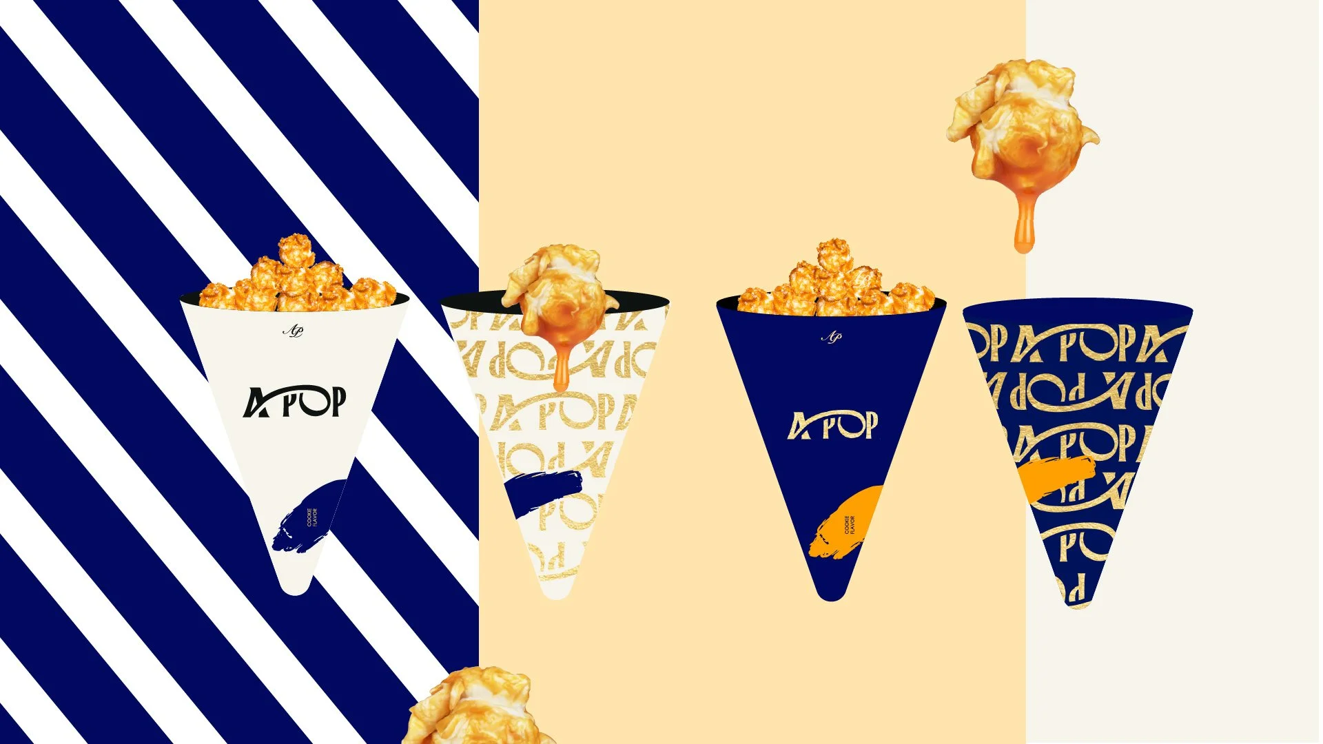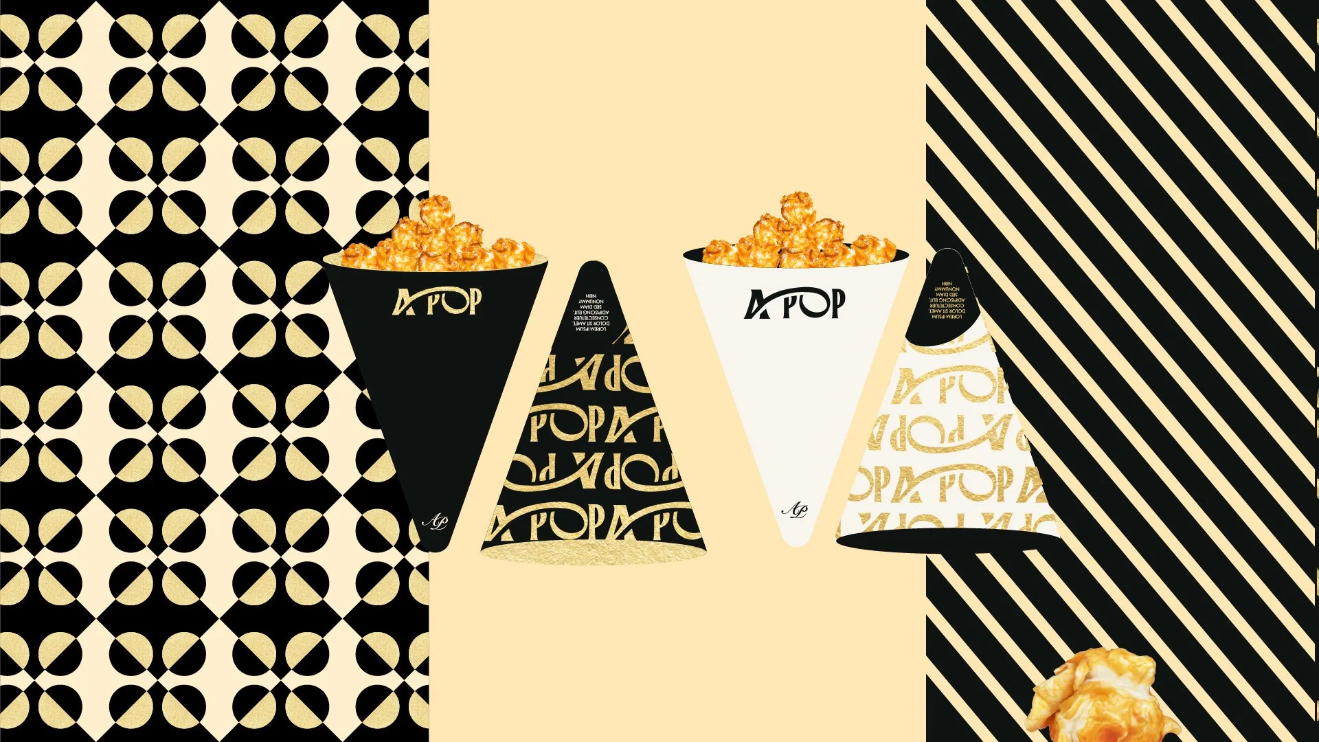 Introducing Apop – a premium popcorn brand that blends sophistication with an unexpected twist of fun. We drew inspiration from classical patterns, infusing them with modern energy to create a sleek, refined identity.